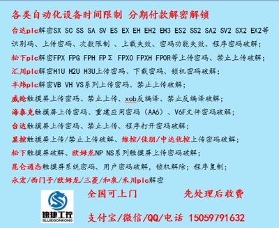 晉江速捷自動(dòng)化科技有限公司 總部地址:福建省晉江市安海汽車站旁 PLC解密電話:15059791632 觸摸屏解鎖咨詢:15059791632